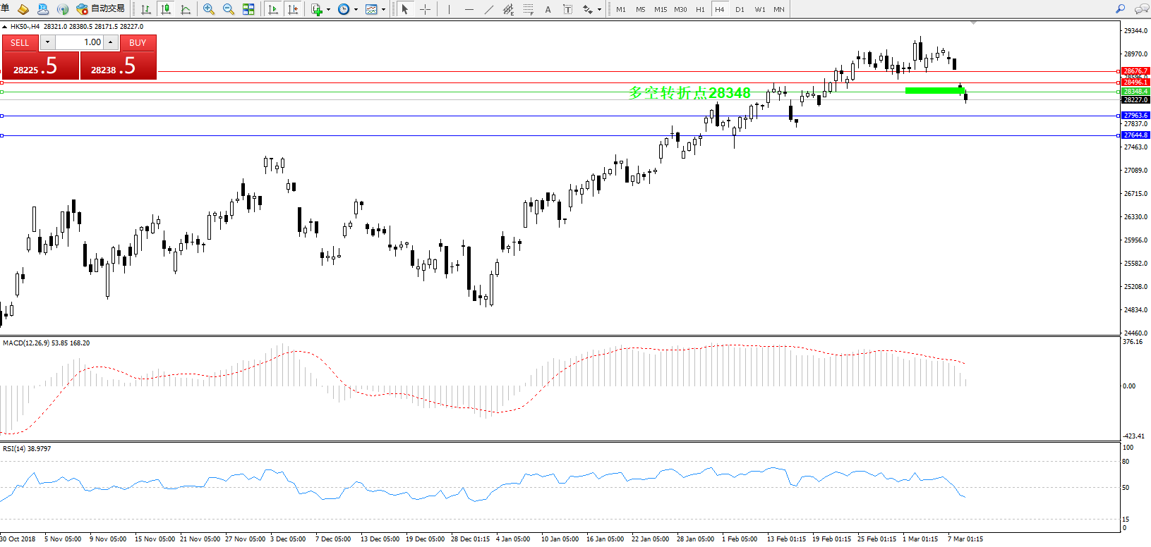 恒指HK50 ——4小时K线图显示: