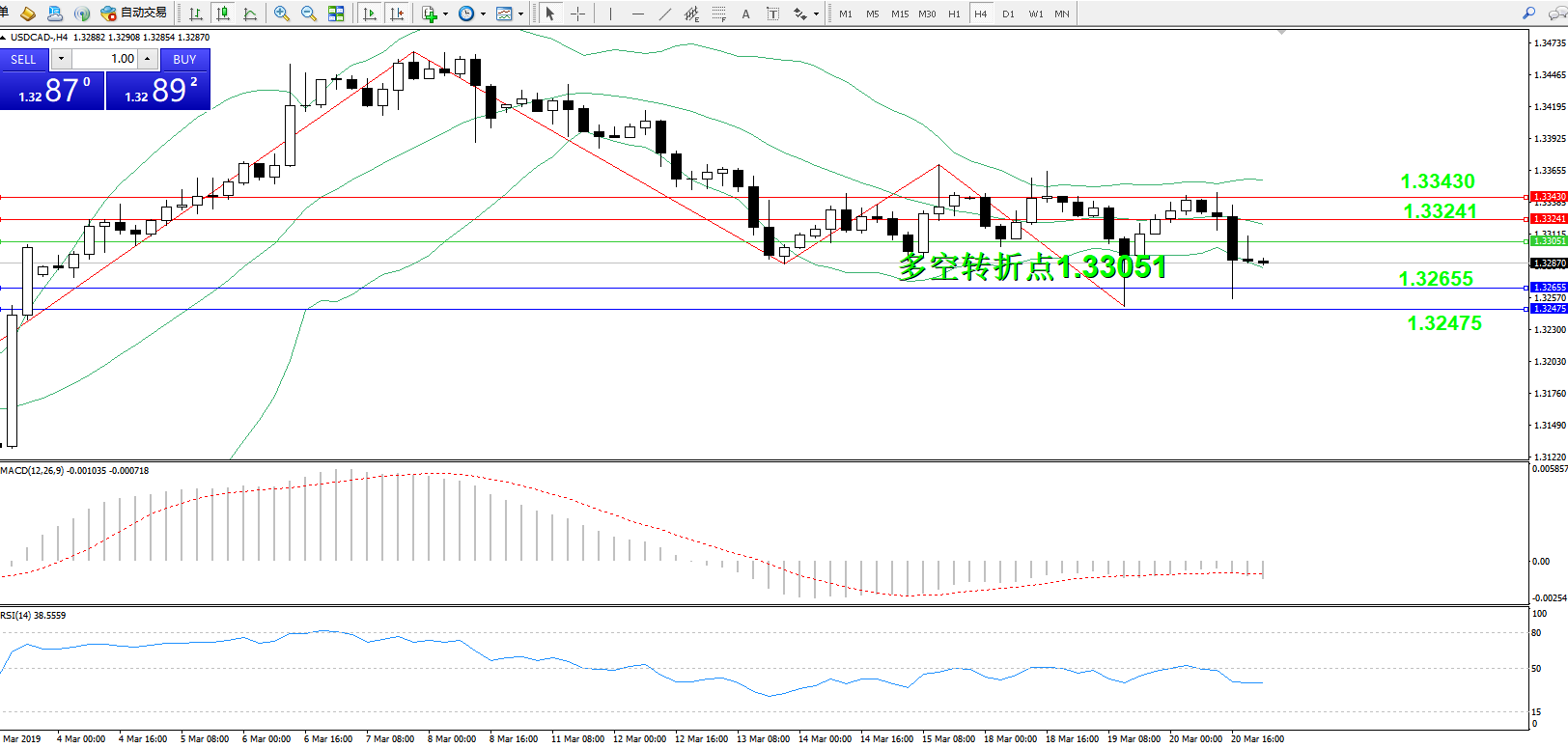 美元兑加元USDCAD—— 4小时K线图显示: