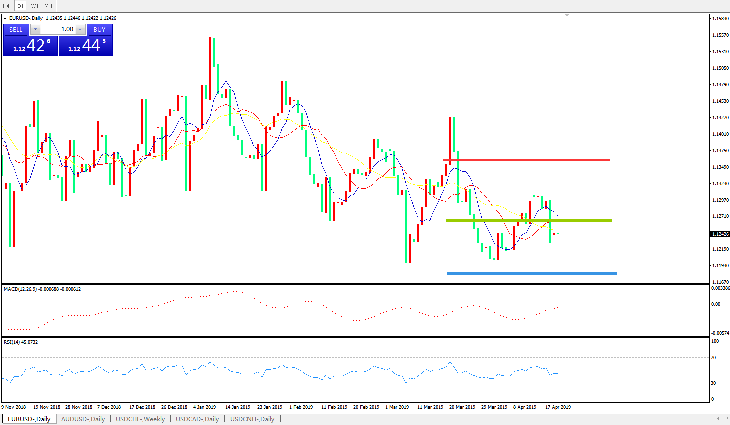 欧元区经济再遭打击,多国PMI数据低于预期。周四公布的德国制造业PMI初值录得44.5,低于市场预期,法国制造业数据同样表现疲软,就连欧元区4月综合PMI初值也不及预期,导致外界担忧欧元区经济的下行趋势将进一步加剧。在以上数据影响下,欧元兑美元日内最低跌至1.1235,创近一周低点。