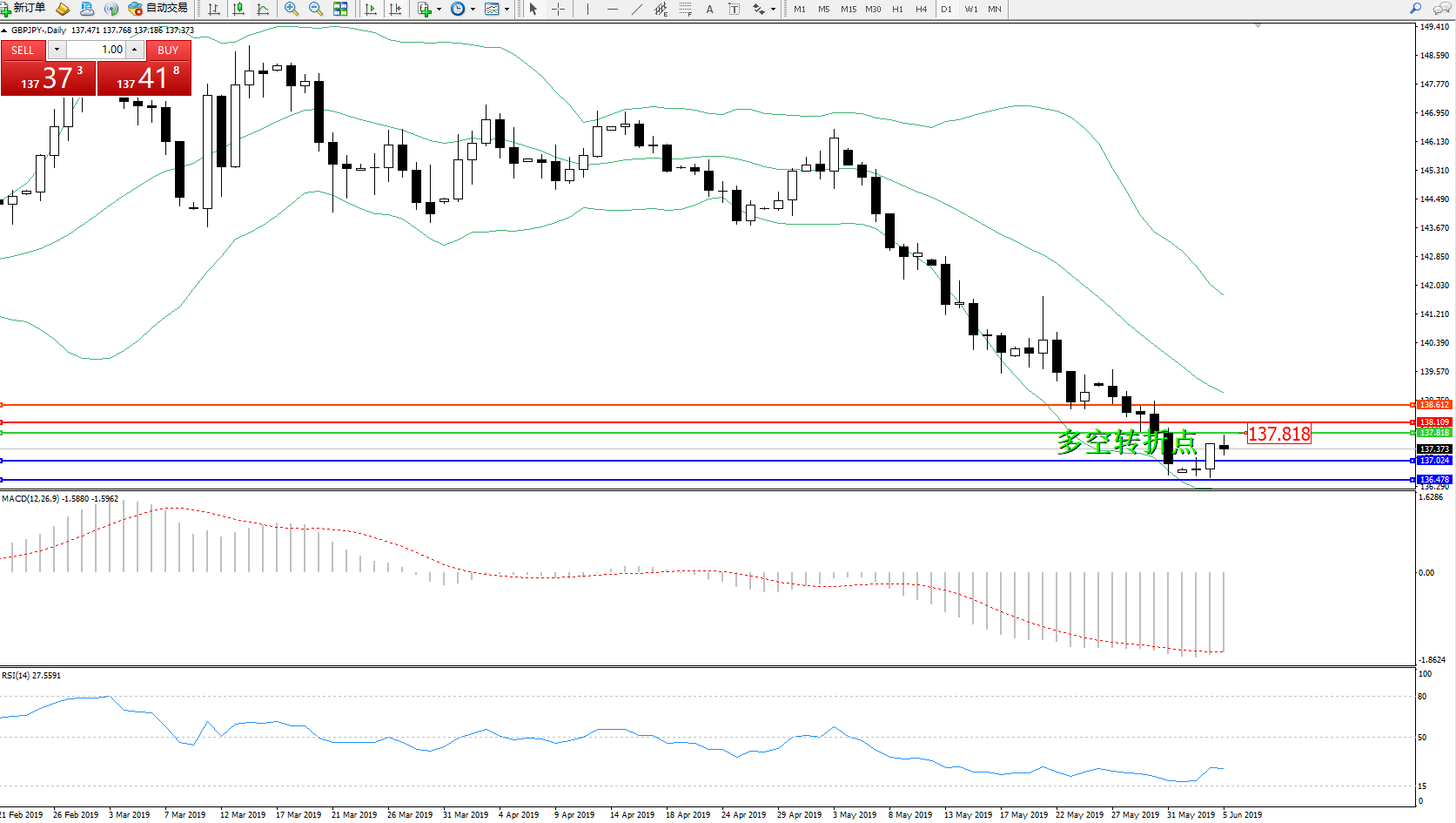 交易策略:137.818下方看跌,目标137.024、136.478