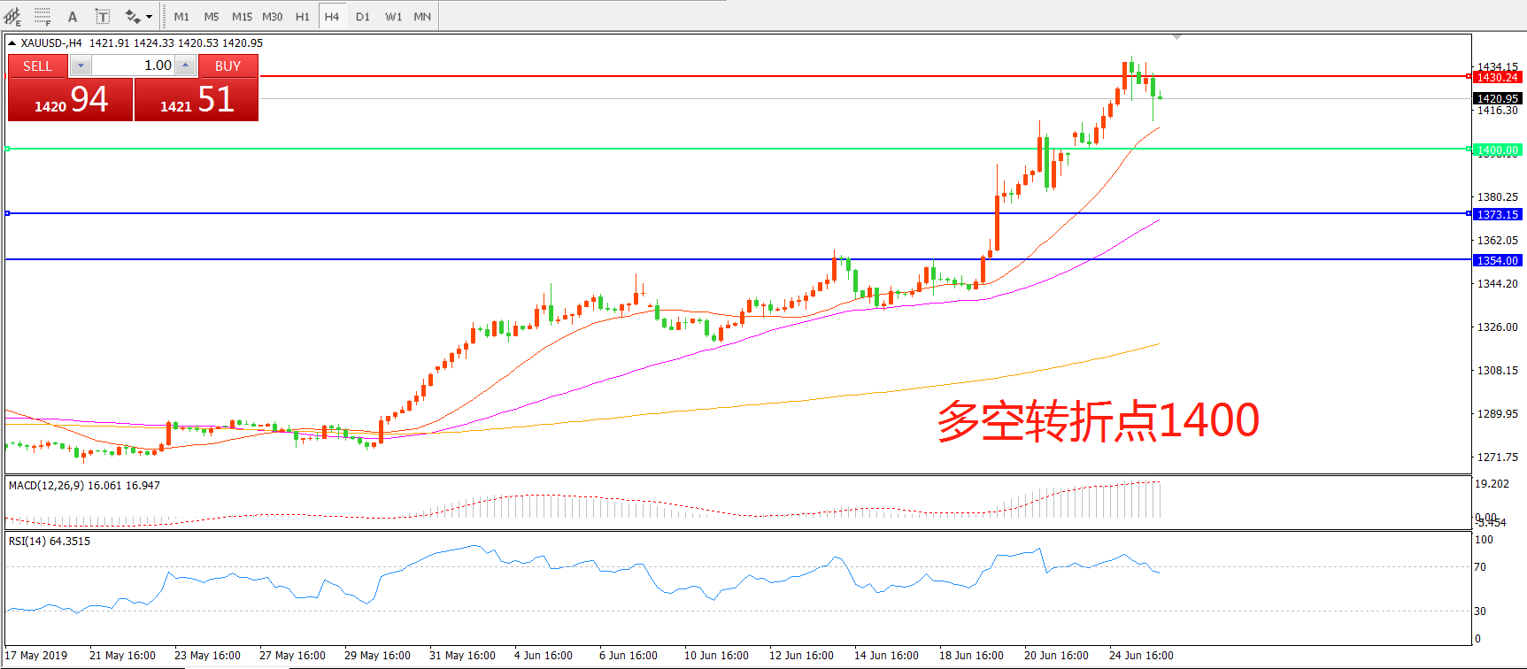 多空转折点:1400.00