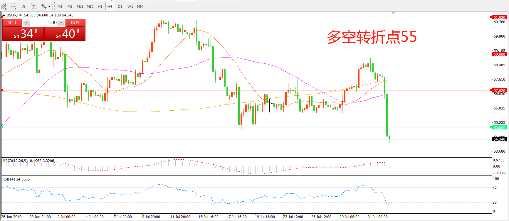 美联储议息会议的基调不及预期鸽派,市场认为美国不太可能实施漫长的宽松周期,8月1日,美国总统特朗普表示将对中国输美商品加征新一轮关税引发市场强烈担忧,贸易关系的不确定性让令原油需求面前景面临重大挑战, 美国原油昨日暴跌7.9%,收报54.38美元/桶,创2015年2月4日以来最大单日百分比跌幅。