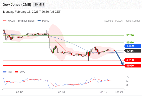 美国道琼斯指数期货 (H6) 当日内: 短期关键阻力位在49820。