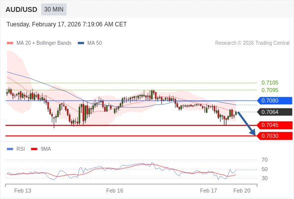 在 0.7080 之下,看跌,目标价位为 0.7045 ,然后为 0.7030 。
