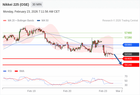 交易策略: 在 56980 之下,看跌,目标价位为 56400 ,然后为 56140 。