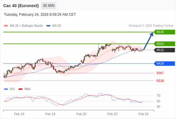 法国CAC指数期货 (Euronext) (H6) 当日内: 期待8555。