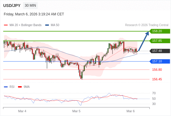 在 157.10 之上,看涨,目标价位为 157.85 ,然后为 158.20 。