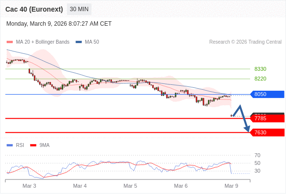 法国CAC指数期货 (Euronext) (H6) 当日内: 短期关键阻力位在8050。