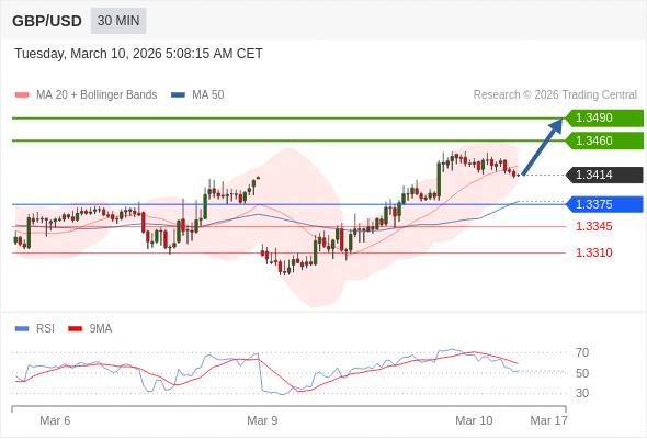 在 1.3375 之上,看涨,目标价位为 1.3460 ,然后为 1.3490 。