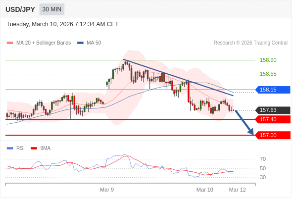 在 158.15 之下,看跌,目标价位为 157.40 ,然后为 157.00 。