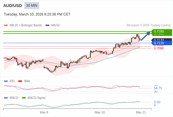 澳元/美元 当日内 : 看涨,当 0.7119 为支撑位,目标定在0.7180。