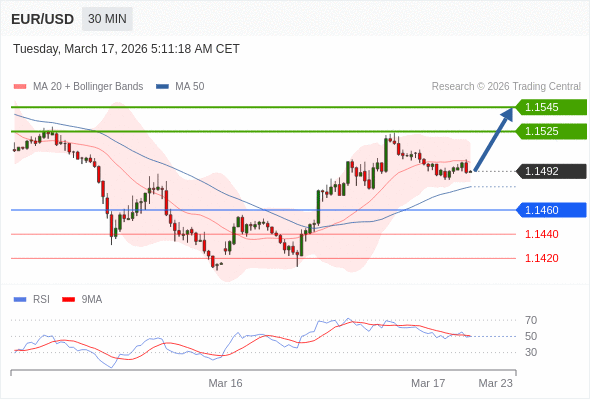 欧元/美元 当日内: 在1.1460之上,看涨。