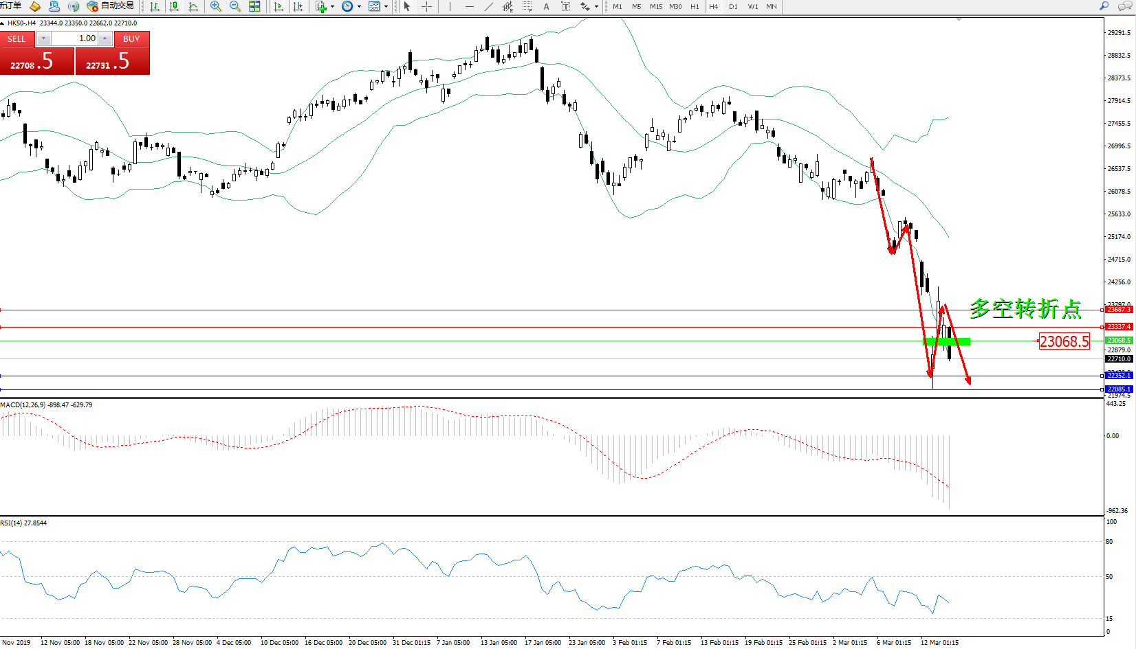恒指HK50 ——4小时K线图显示: