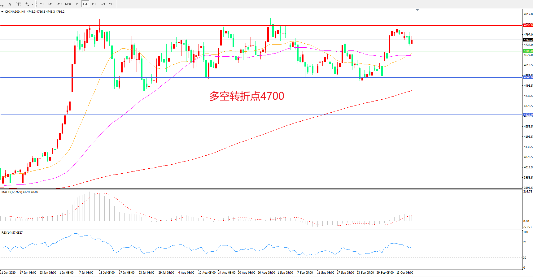 4小时图看,沪深300延续高位震荡,短期方向并不明显,4850成为明显阻力,均线系统走平, MACD红柱增加,RSI指标向上,日内延续震荡概率较大。