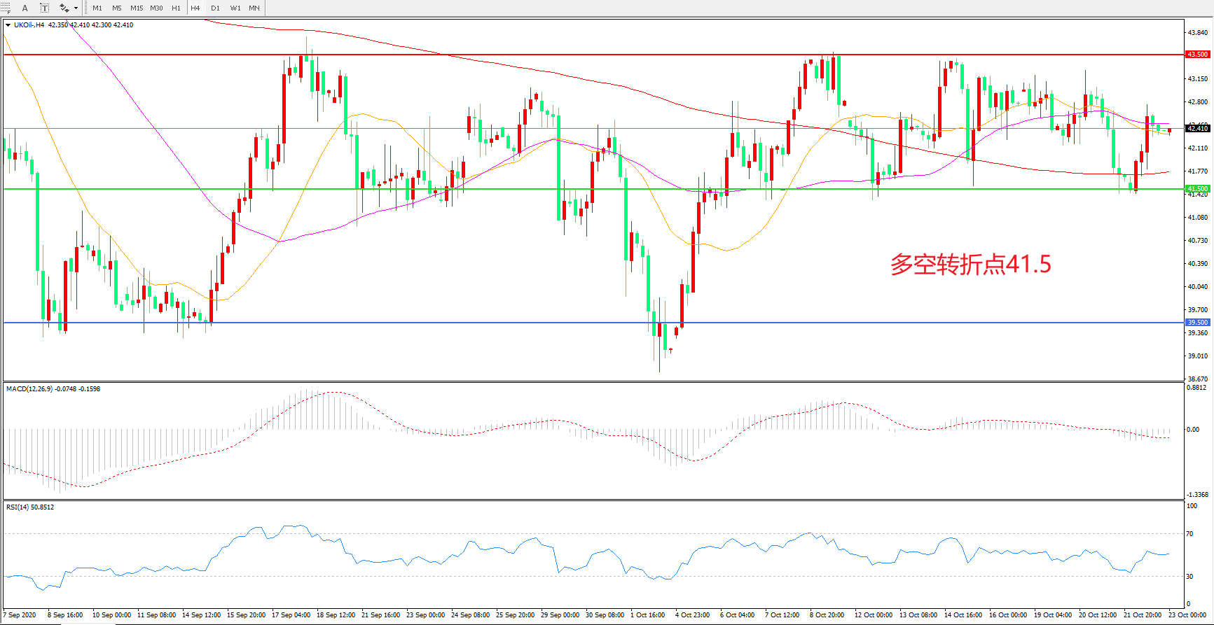 4小时图看,油价回踩41.5美元附近小幅反弹,箱体震荡形态明显,200周期均线成为下方支撑,41.5成为上方阻力,MACD红柱增加,RSI指标走平,日内延续震荡概率较大。