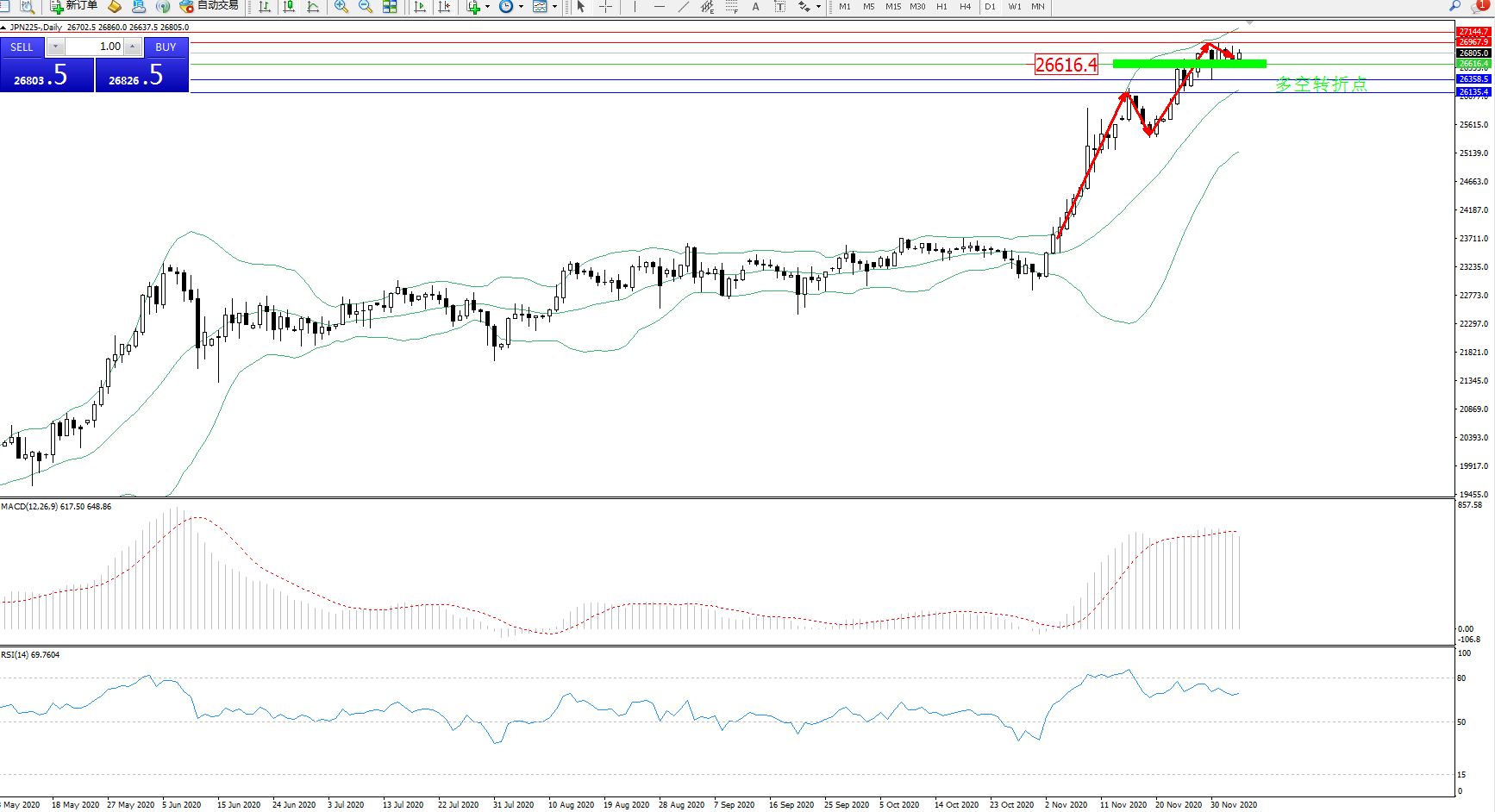 交易策略:26616上方看涨,目标26967、27144