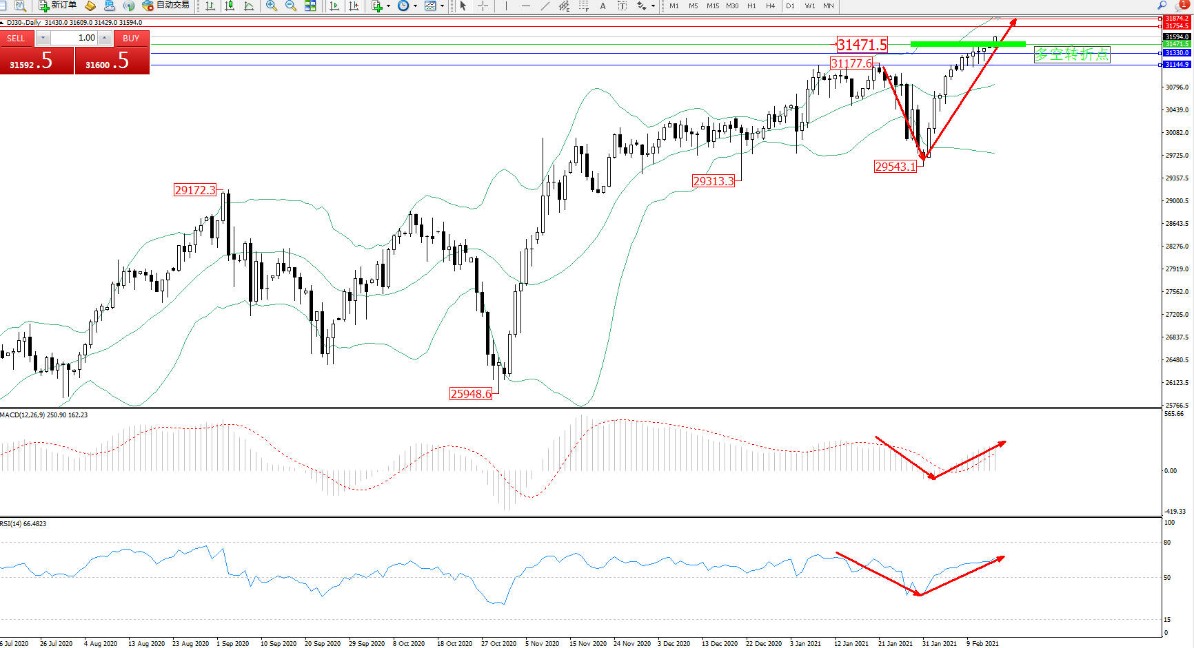 技术点评:高位呈V型反转态势强势拉升上扬,处于布林带指标中上轨区间持续震荡上扬,布林带指标呈缓慢张口走势持续中,多头动力有进一步上扬态势,MACD指标处于多头区域持续整理上移中,RSI指标处于多头区域维持持续徘徊上行中;