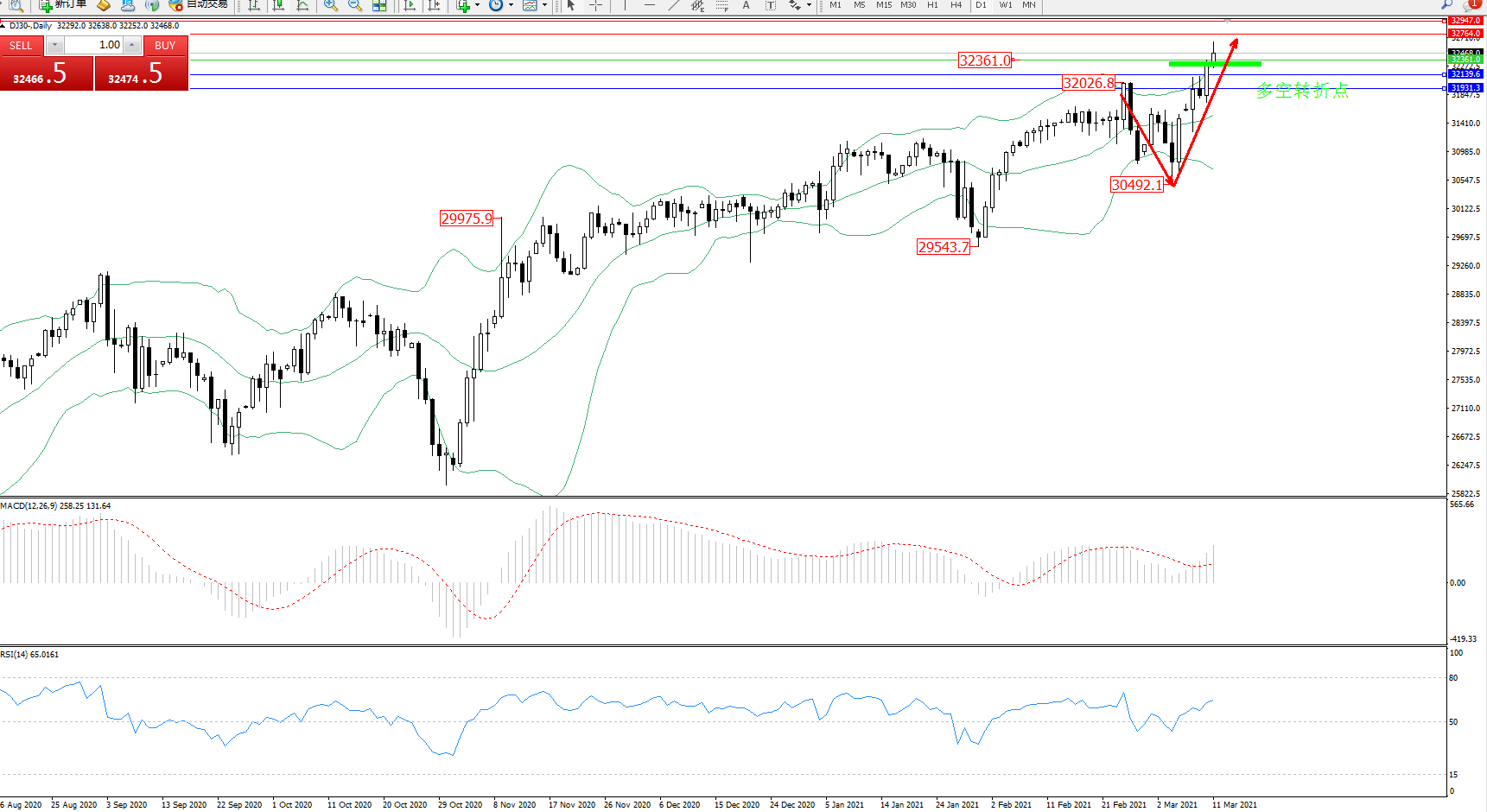 技术点评:高位空头动力持续震荡下行后,低位30492位置得到支撑,多头动力强势入场反转上扬,突破布林带指标上轨附近节点后不断向上移动中,布林带指标呈张口走势中,多头动力尚未有最终止步迹象,MACD指标处于多头区域维持震荡向上移动态势良好,RSI指标处于多头区域维持震荡向上移动中;