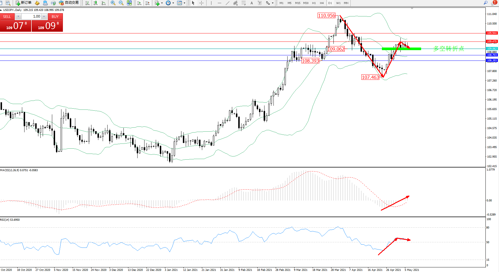 技术点评:高位空头动力延续空头下行走势持续下挫,触及布林带指标下轨附近节点后不断向下移动,空头动力下行至107.463附近得到支撑短暂整理后急速回升,突破中轨触及上轨附近后遇阻开始震荡,布林带指标呈张口走势后开始缓慢收口中,MACD指标处于0轴线下方空头区域持续震荡后开始有回升迹象,RSI指标处于空头区域整理后急速反转上行,在50均衡线节点上方弱势震荡;