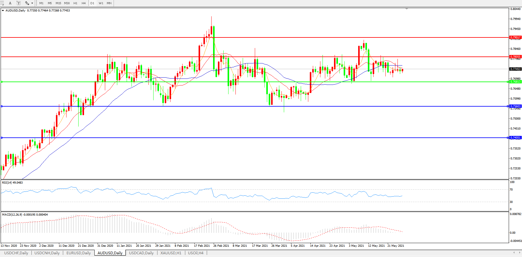 交易策略:0.7680上方看涨,目标0.7800、0.7900