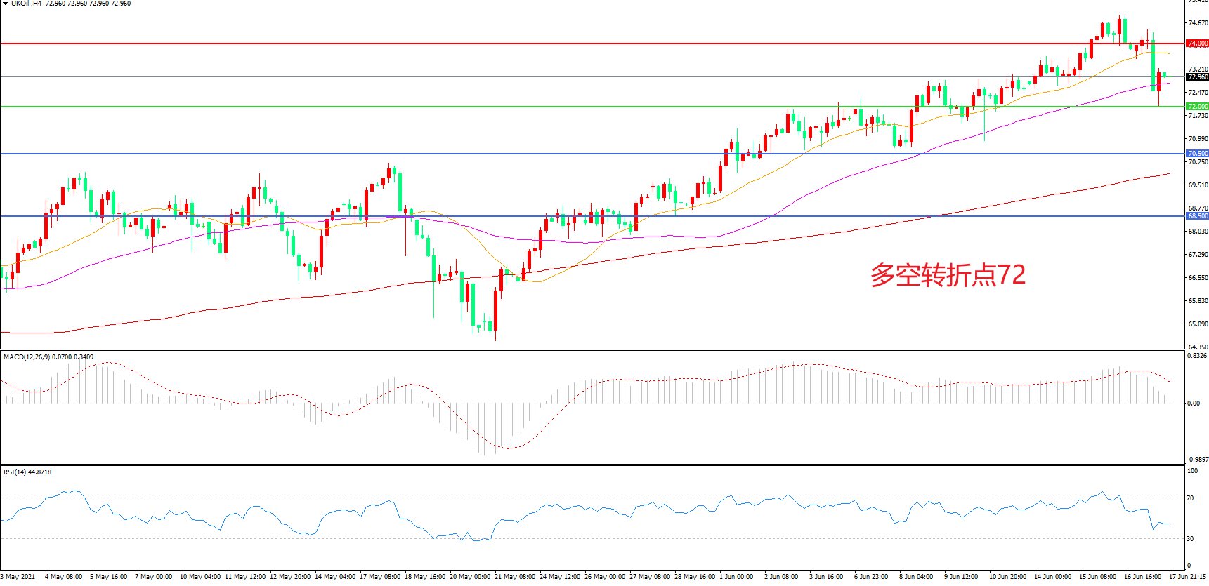 周四(6月17日),在美联储鹰派发声和中国抛储消息得到官方确认后,持续走弱的商品市场跌幅进一步扩大,布伦特原油连续两日下跌,收报72.96美元/桶。美指短期的强势表现让油价再次承压,但从中期来看,在供给端没有明显增加的情况下,油价自身的基本面仍然会比较强,飙升的需求和有限的供应将推动油价继续走高。