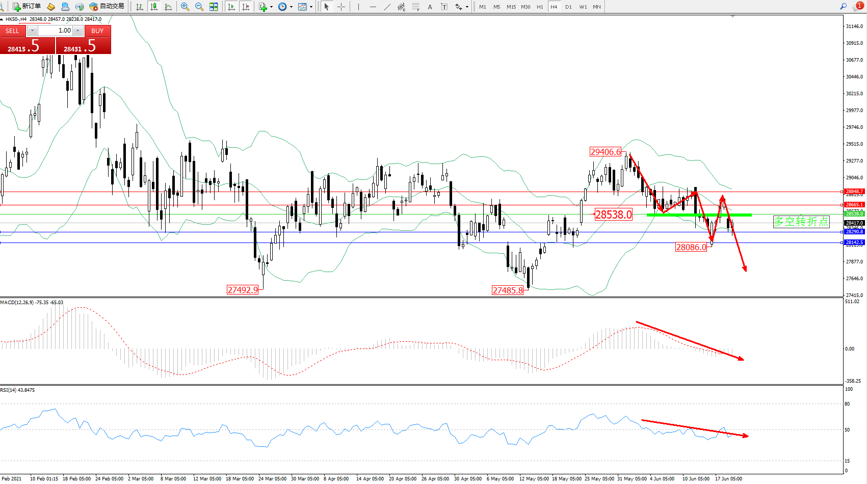 恒指HK50 ——4小时K线图显示: