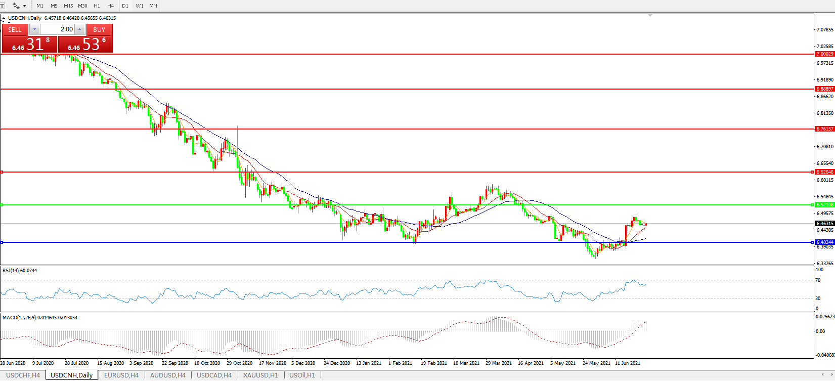 备选策略: 在6.5200之上,看涨,目标价位为6.6270,然后为6.7615。
