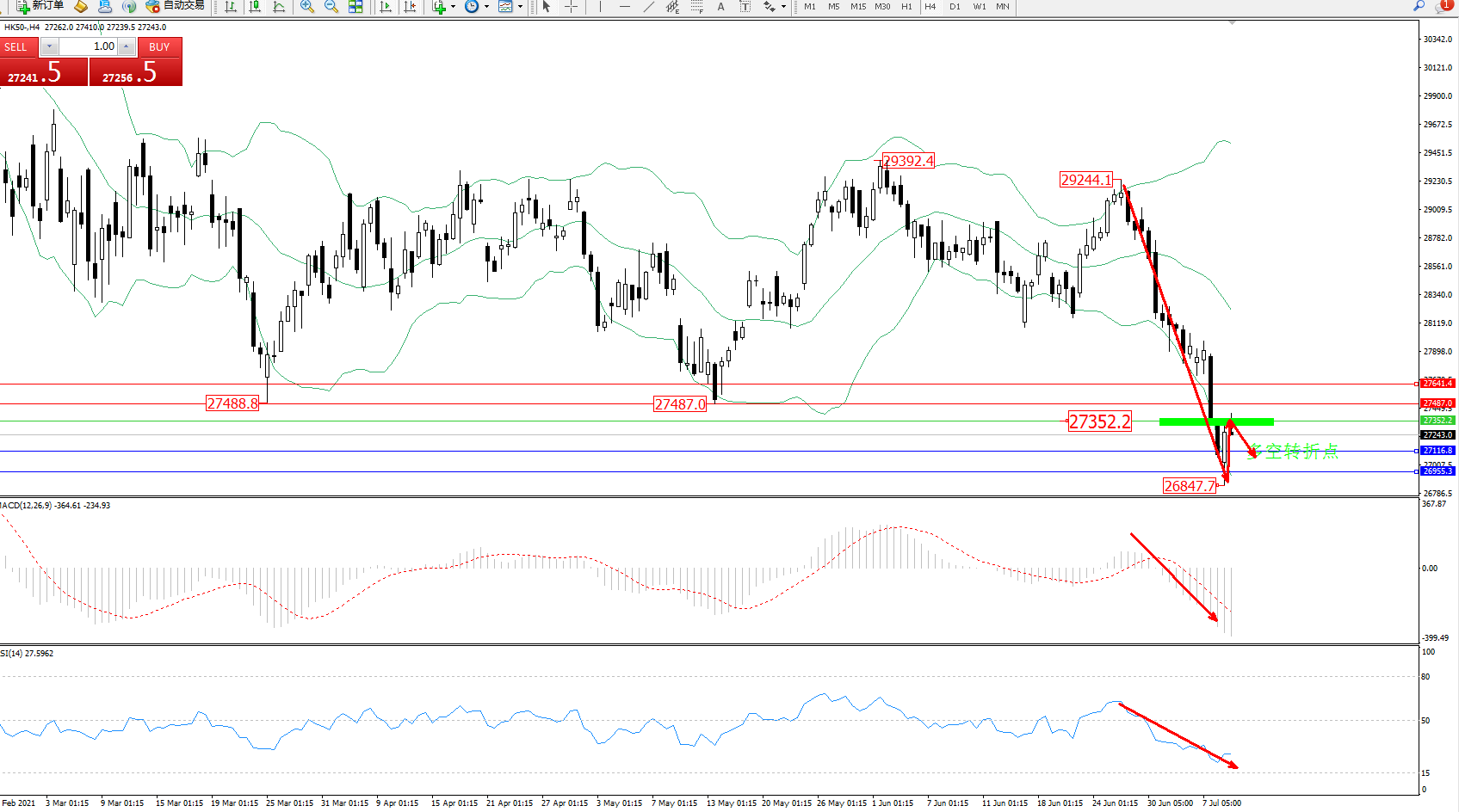 技术点评:空头动力延续布林带指标下轨附近附近持续下探,低位抵达26847位置短暂回升,但下行趋势态势良好,且未见最终止步迹象,布林带指标呈张口走势持续中,上轨附近有短暂下移迹象,MACD指标空头动力急速下挫态势良好,RSI指标处于空头区域低位持续震荡后有平缓走势;