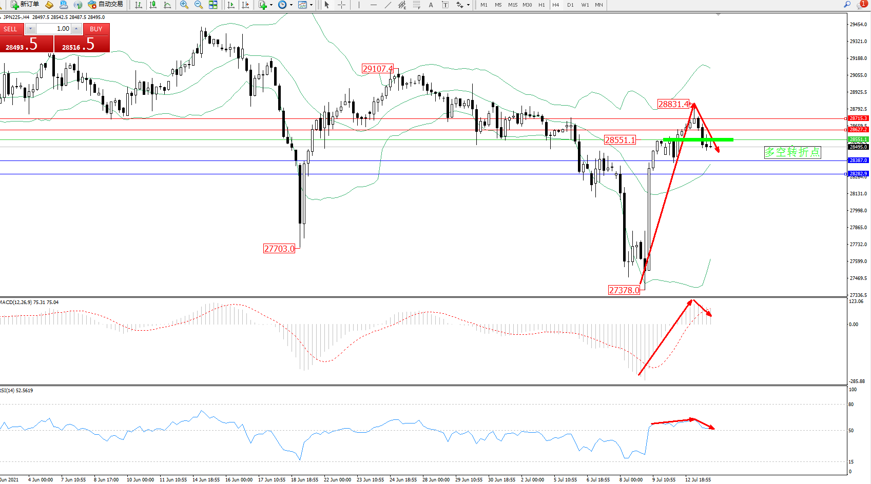 技术点评:多头动力强势回升至28831附近遇阻回撤,布林带指标通道呈收口走势中,高位空头压制短期内依旧强劲,MACD指标处于多头区域维持整理回撤,RSI指标处于50均衡线上方多头区域维持整理平移中;