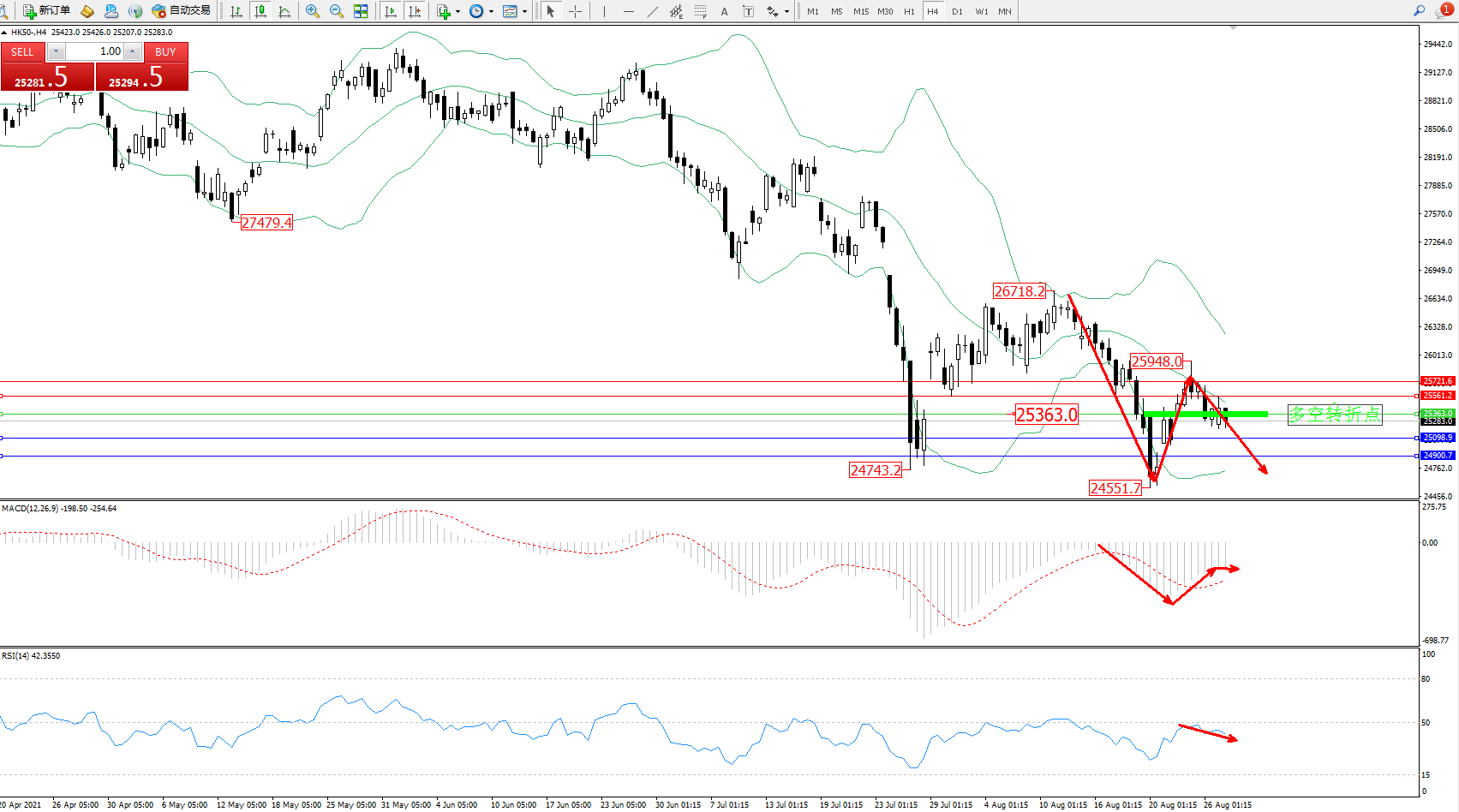 恒指HK50 ——4小时K线图显示: