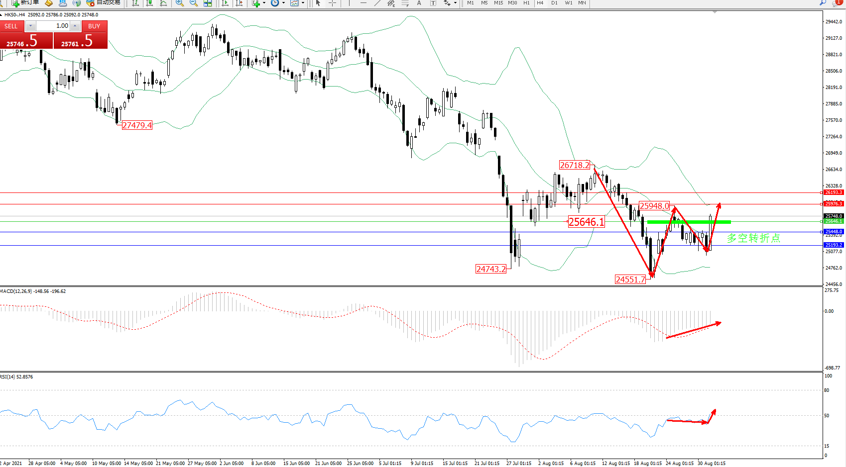 恒指HK50 ——4小时K线图显示: