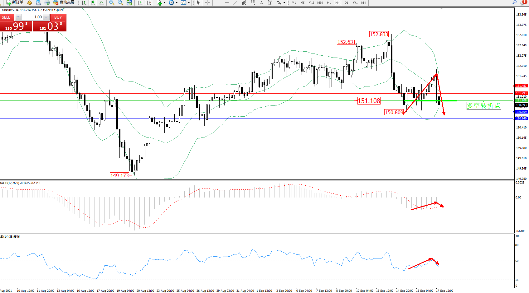 交易策略:151.108下方看跌,目标150.809、150.640