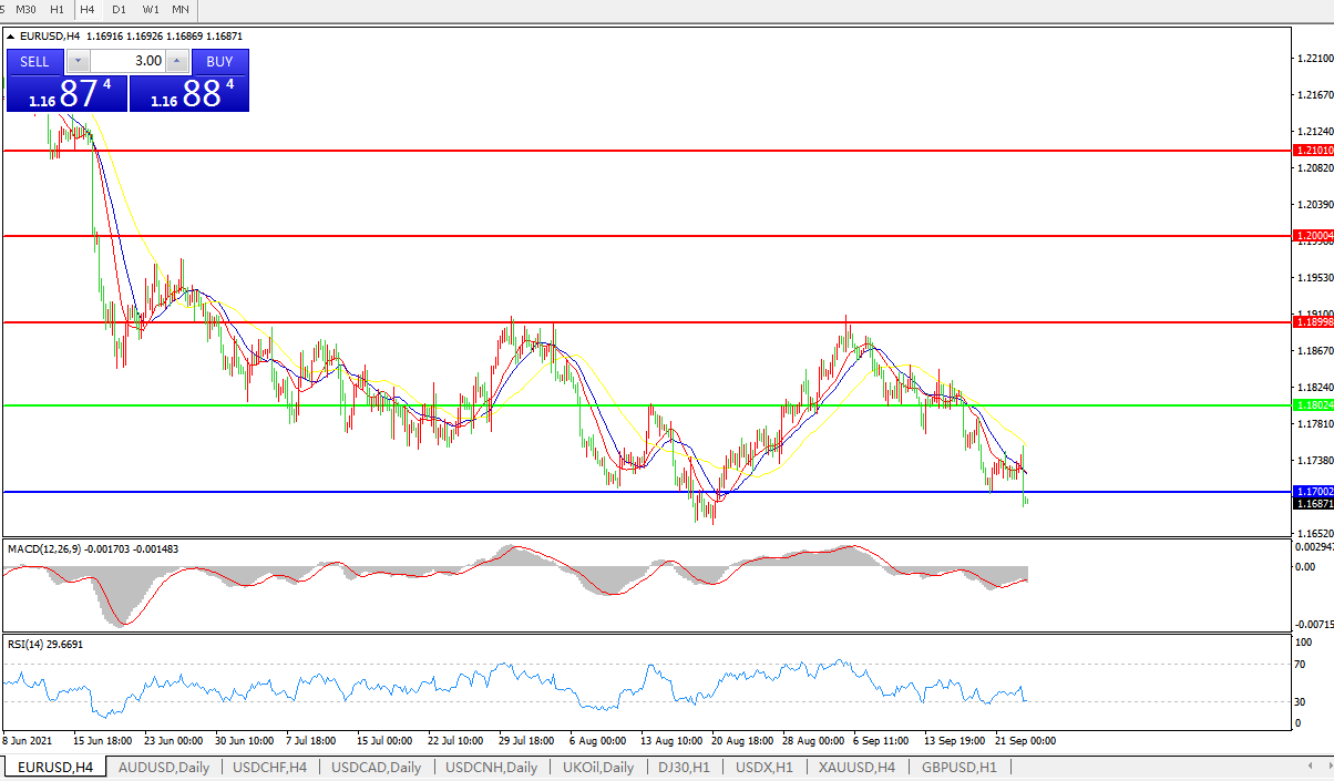 欧元兑美元汇率一个月来首次跌破1.17美元;一度下跌0.33%至1.1685,为8月20日以来最低;美联储声明发布后的几分钟内,该汇率出现震荡走势,触及盘中高点和低点;交易员们权衡了美联储声明称即将开始减码的模糊性以及点阵图显示FOMC成员对于明年是否加息呈势均力敌的看法。