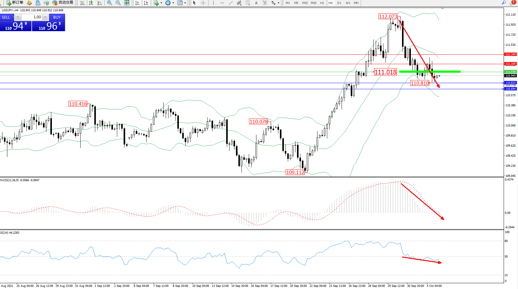 交易策略:111.018下方看跌,目标110.810、110.694