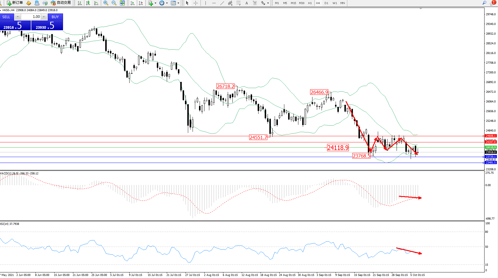 恒指HK50 ——4小时K线图显示: