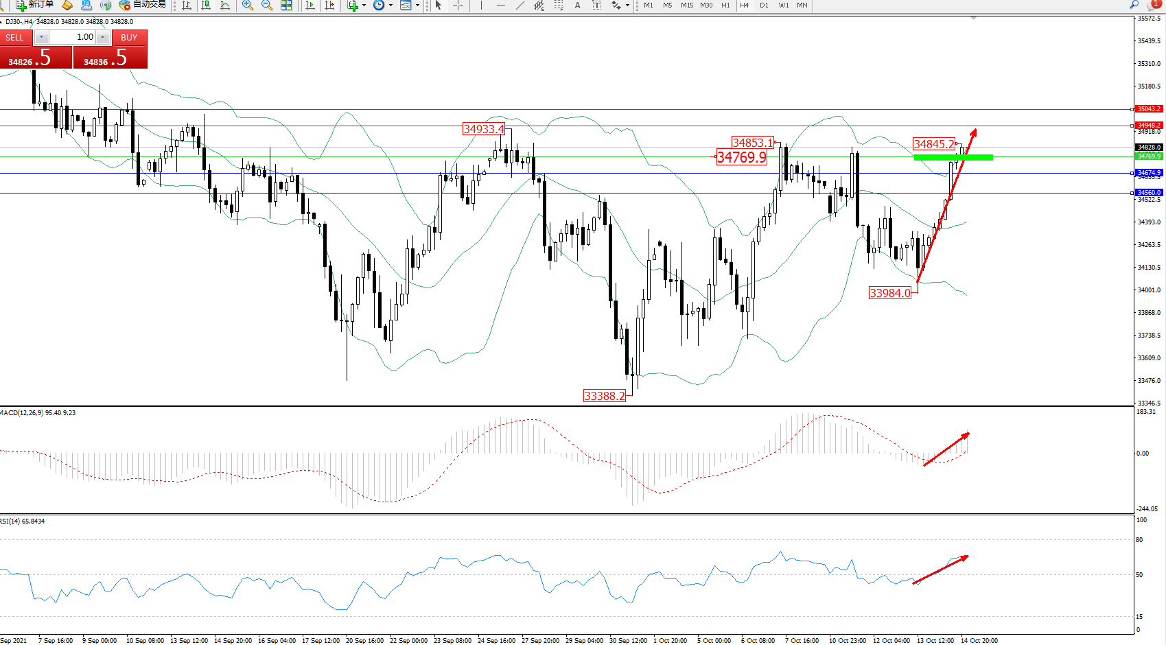 技术点评:多头动力强势拉升上扬,触及布林带指标上轨附近节点34845后开始整理,多头动力有继续上移态势,布林带指标呈张口走势持续中,MACD指标处于0轴线上方多头区域维持整理上移,RSI指标处于多头区域维持震荡不断向上拉升中;