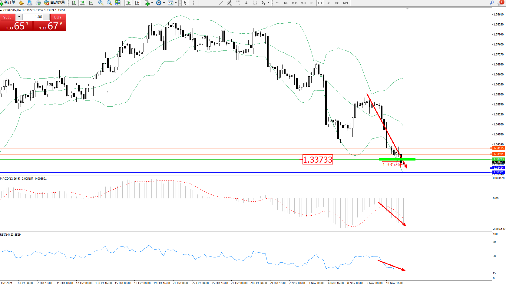 交易策略:1.33733下方看跌,目标1.33454、1.33301
