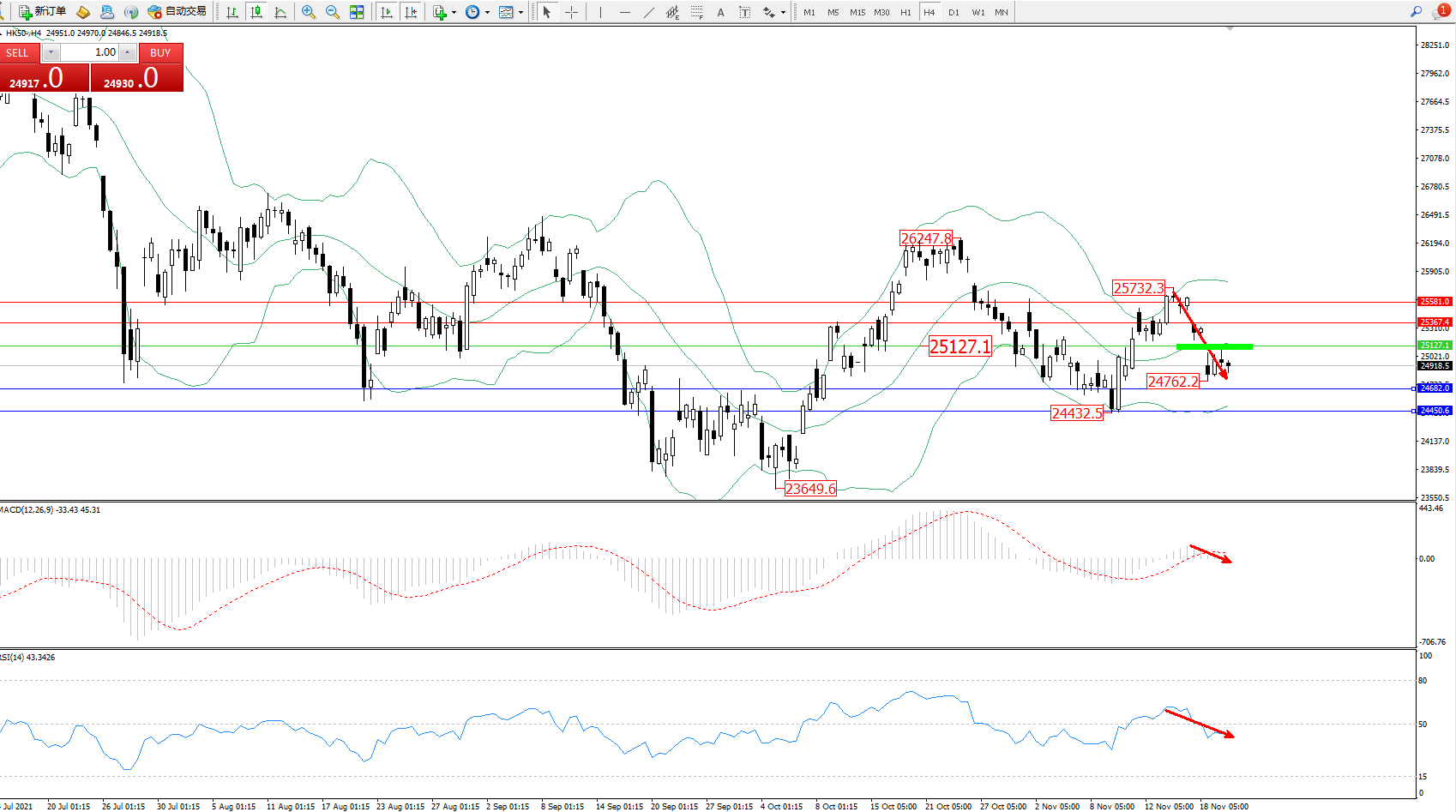 恒指HK50 ——4小时K线图显示: