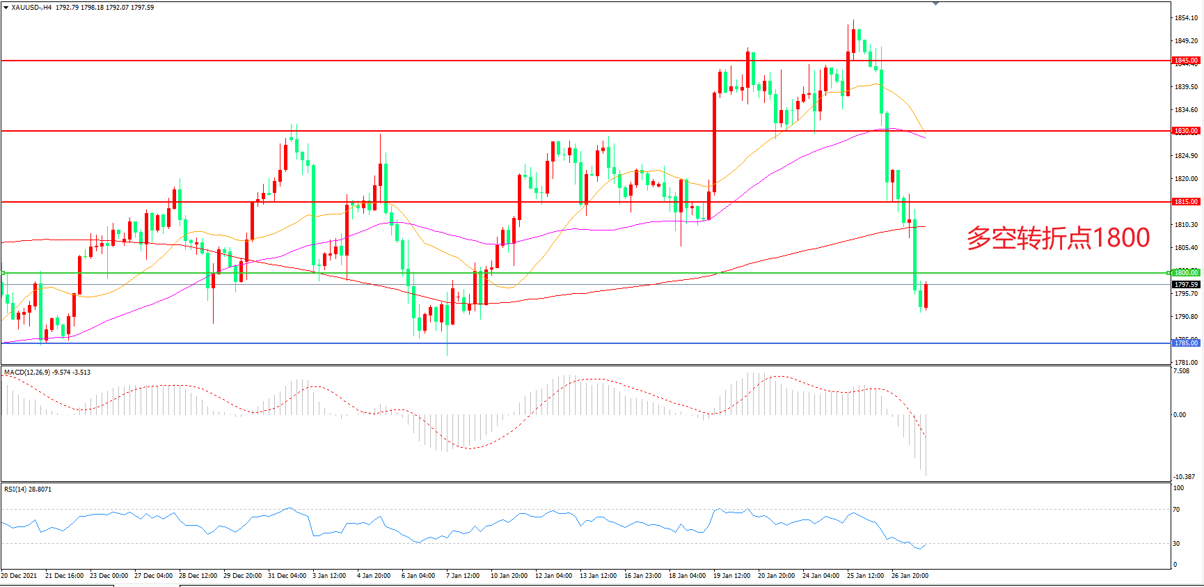 交易策略:在1800.00之下看跌,目标1785.00       1760.00