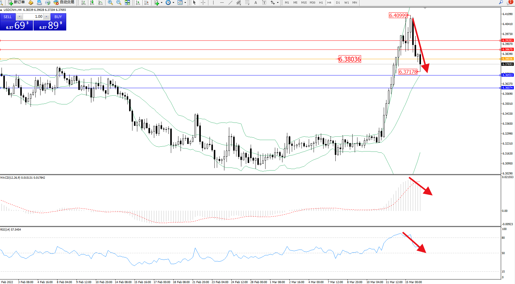 美元人民币USDCNH——4小时K线图显示: