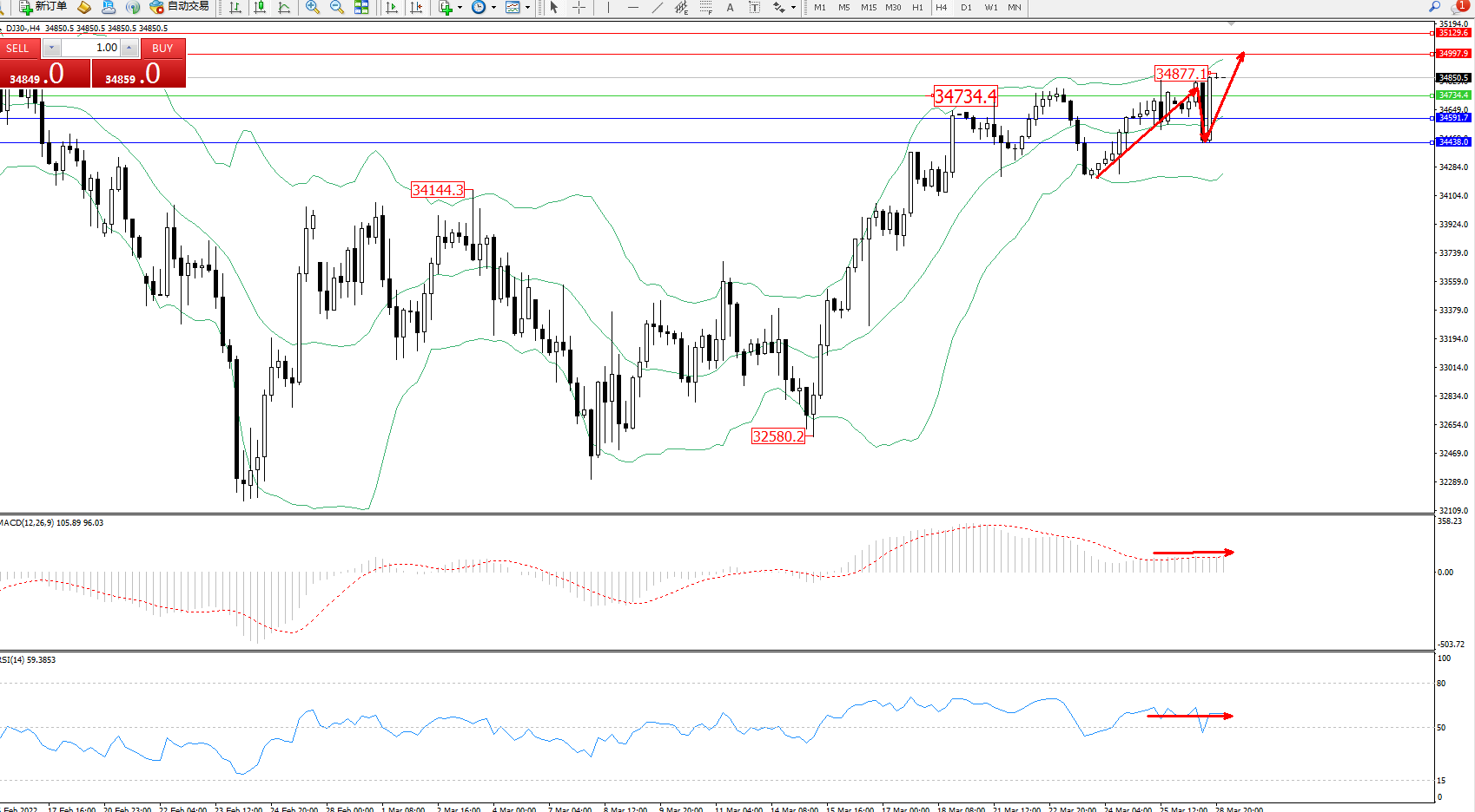 道琼斯指数DJ30——4小时K线图显示: