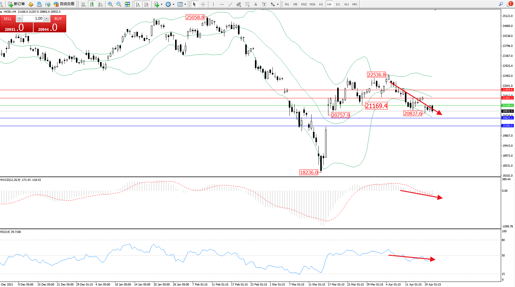 恒指HK50 ——4小时K线图显示: