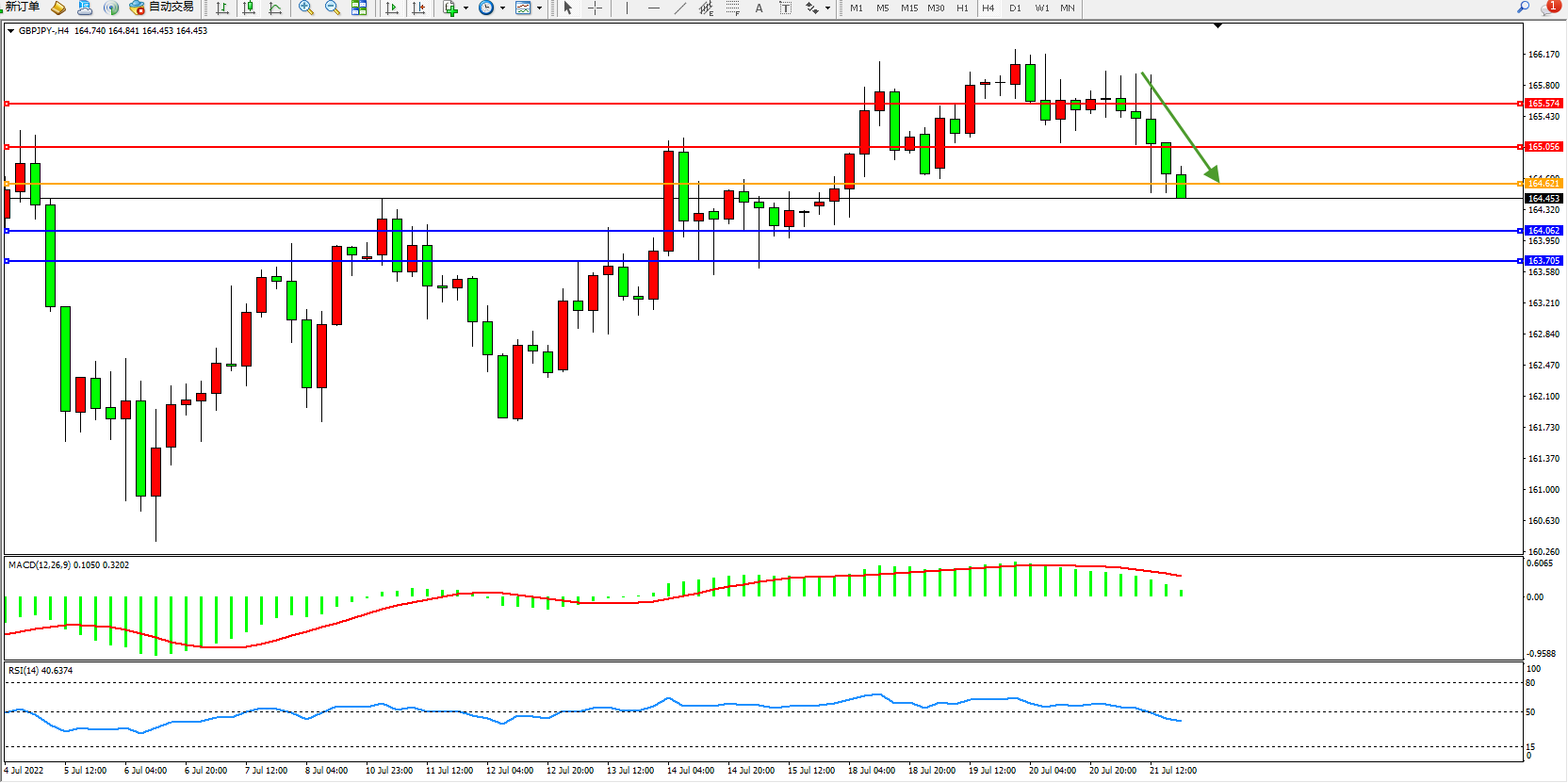 交易策略:164.621下方看跌,目标164.062、163.705