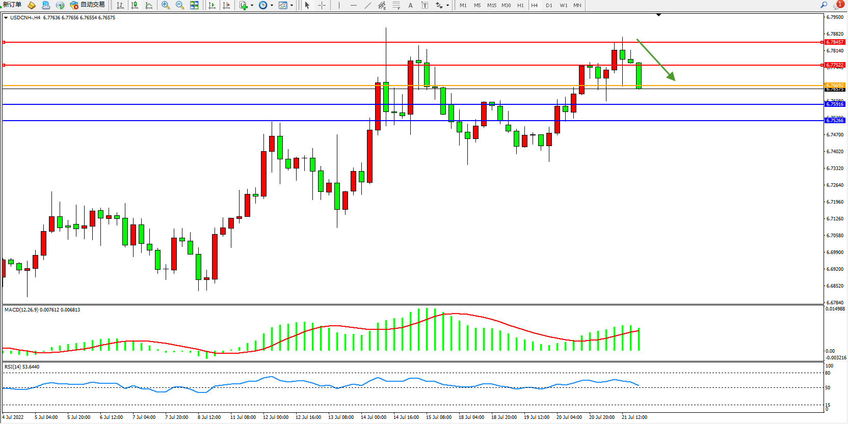交易策略:6.76692下方看跌,目标6.75916、6.75266