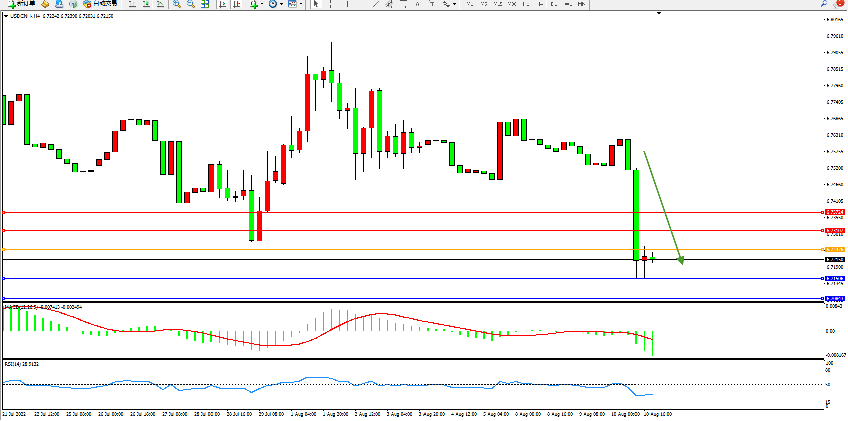 美元人民币USDCNH——4小时K线图显示: