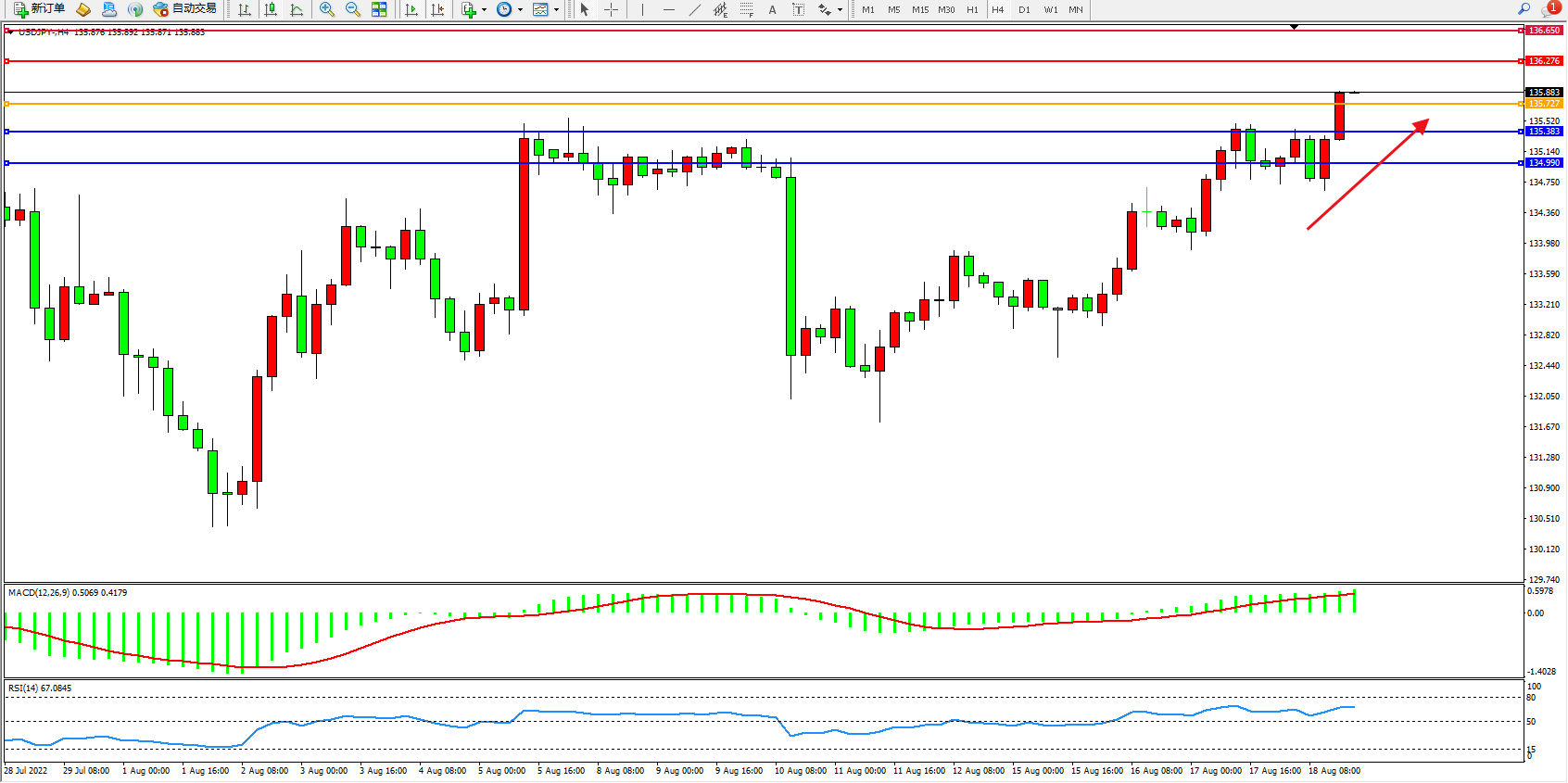美元日圆USDJPY——4小时K线图显示: