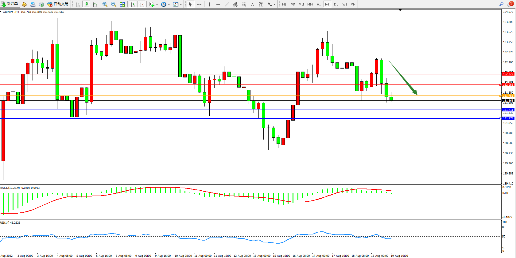 交易策略:161.789下方看跌,目标161.411、161.175