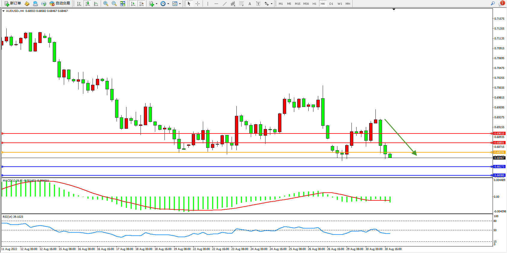 交易策略:0.68591下方看跌,目标0.68273、0.68080