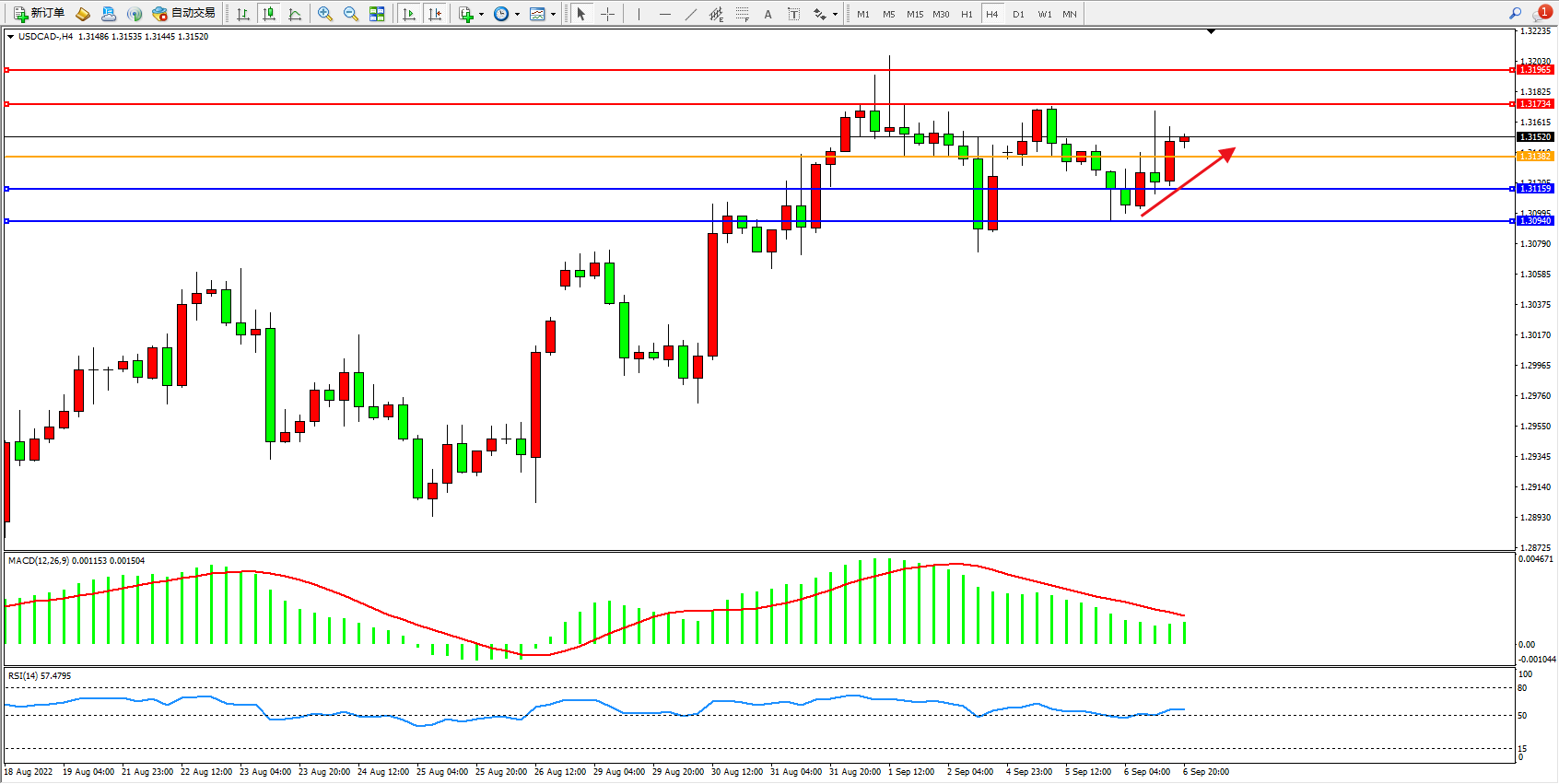 美元加元USDCAD——4小时K线图显示: