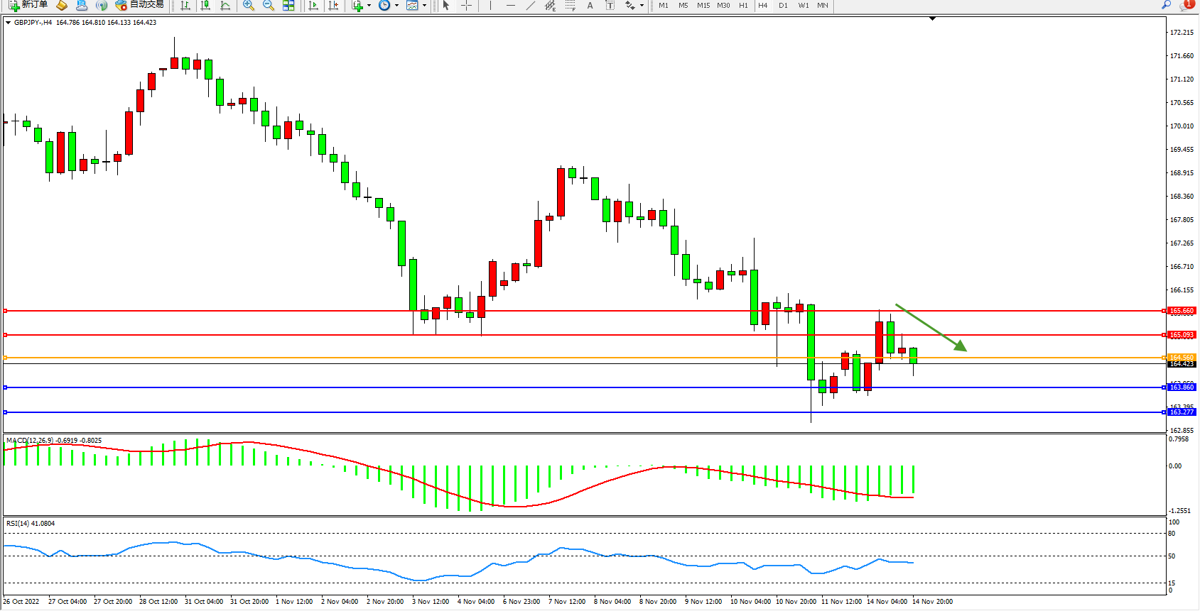 交易策略:164.560下方看跌,目标163.860、163.277